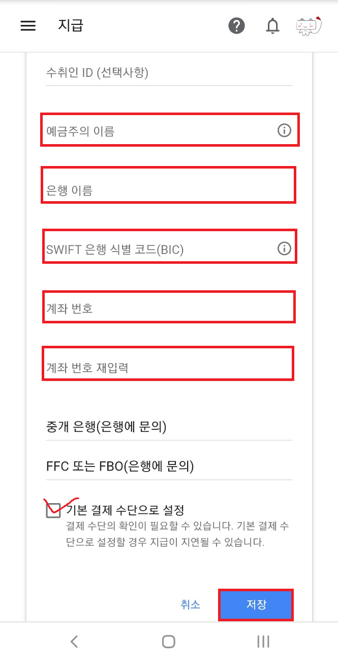 새 은행 송금 세부정보 추가를 체크하시고,
