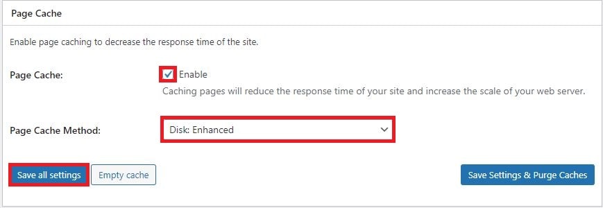 Page Cache Enable을 체크하시고 Page Cache Method 는 Disk: Enhanced를 설정해놓고 Save all Settings 를 클릭합니다. 물론, Save all Settings 는 다 설정하고 나서 마지막에 눌러도 되긴합니다. 마지막 설정까지하고 다시 언급하겠습니다.